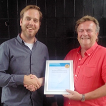 PPP bestuurslid Niels Peters overhandigt het gouden CSR Promotional Products certificaat aan Dick Brandwijk (r)