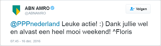Een flink aantal ABN-AMRO-ers ging door de PPP guerrilla actie als onderdeel van de landelijke campagne ‘Eind goed, alles goed’ toch met een kerstpakket naar huis. Dat leverde veel verrassende en dankbare reacties op, die van harte op de social media werden gedeeld. Ook ABN-AMRO reageerde sportief op dit PPP initiatief.
