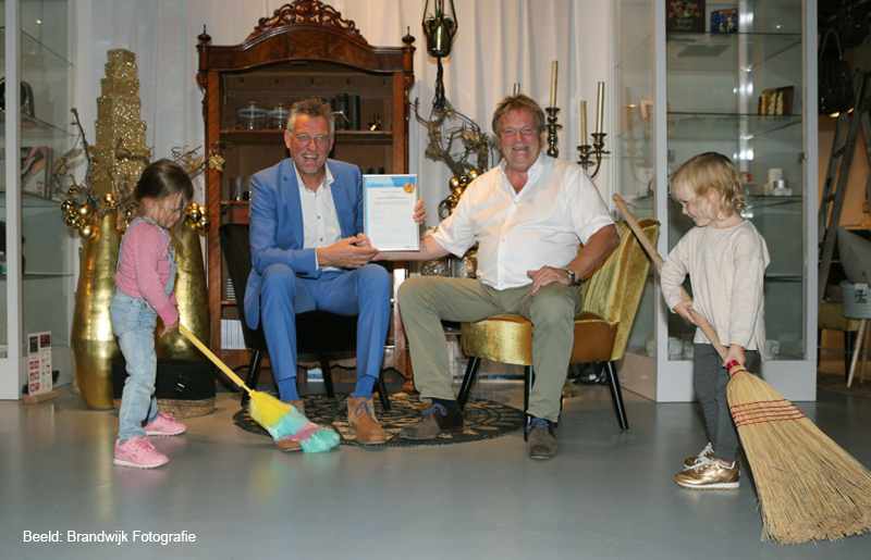 PPP voorzitter Joop van Veelen overhandigt aan Dick Brandwijk – met zijn spelende kleinkinderen Julia en Saar van dochter Kimberly – het CSR Gold Certificaat. Een toepasselijk beeld, zie onder.
