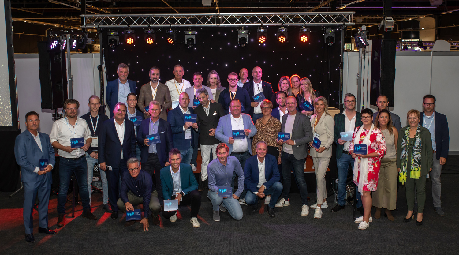 Ruim 25 geaccrediteerde bedrijven op het podium om het certificaat en het nieuwe muurschildje in ontvangst te nemen