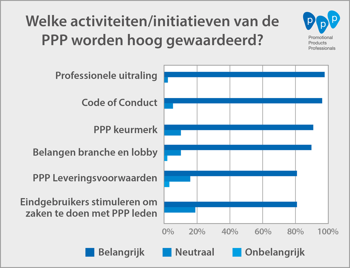 Ook de Code of Conduct, de belangenbehartiging en lobby activiteiten en het gebruik van de leveringsvoorwaarden werden als belangrijk bestempeld. Daarnaast toont het onderzoek duidelijk aan dat er door de leden van de branchevereniging een actieve rol wordt verwacht, als het gaat om voorlichting richting eindklanten over de meerwaarde van promotionele producten en om zaken te doen met PPP leden.